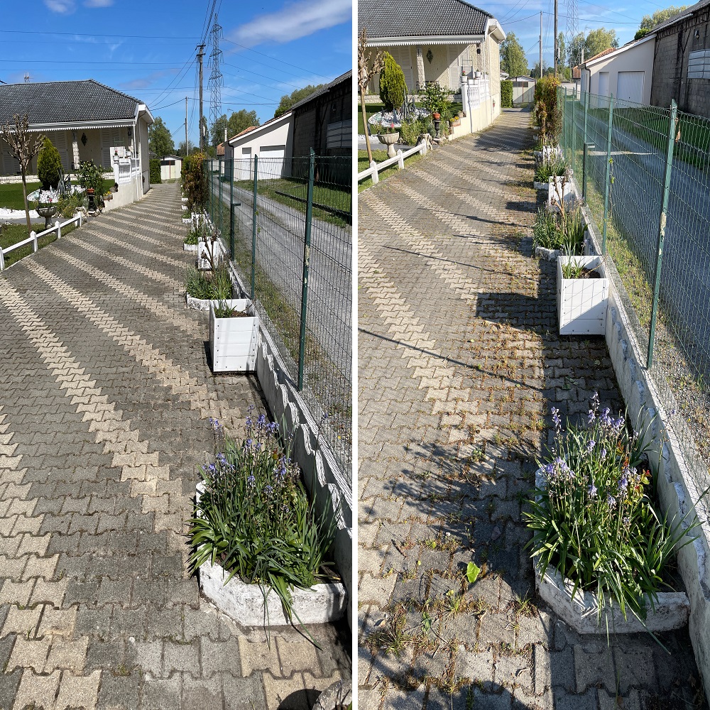 Au Soleil Des Espaces Verts nettoyage des joints et désherbage manuel d'une allée pavés à Martillac